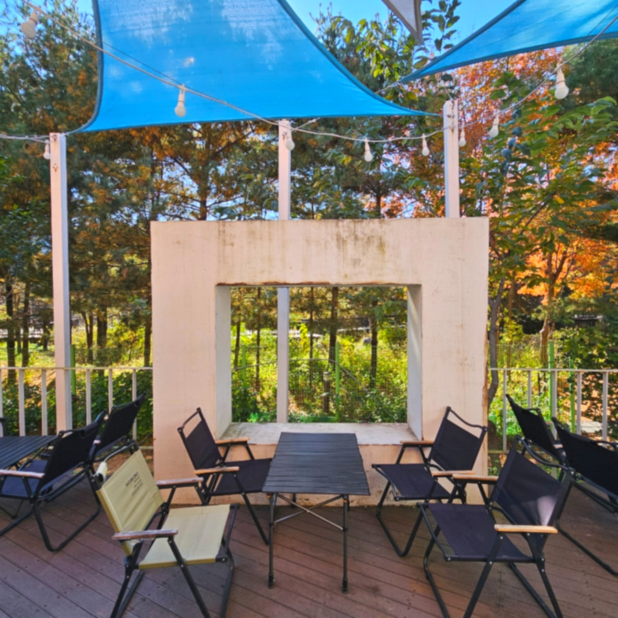 캠핑 용품들로 꾸며진 테라스가 정말 감성적이에요